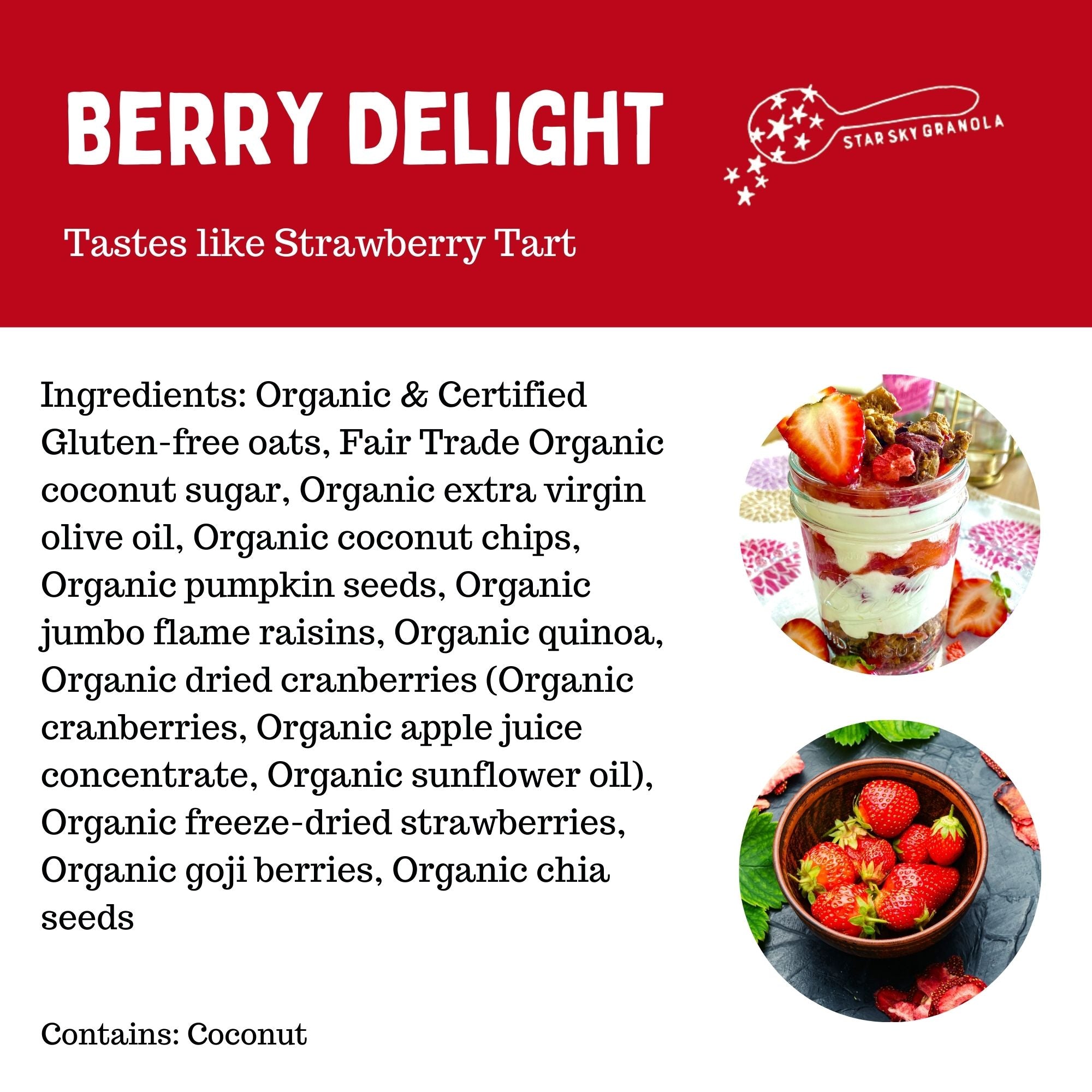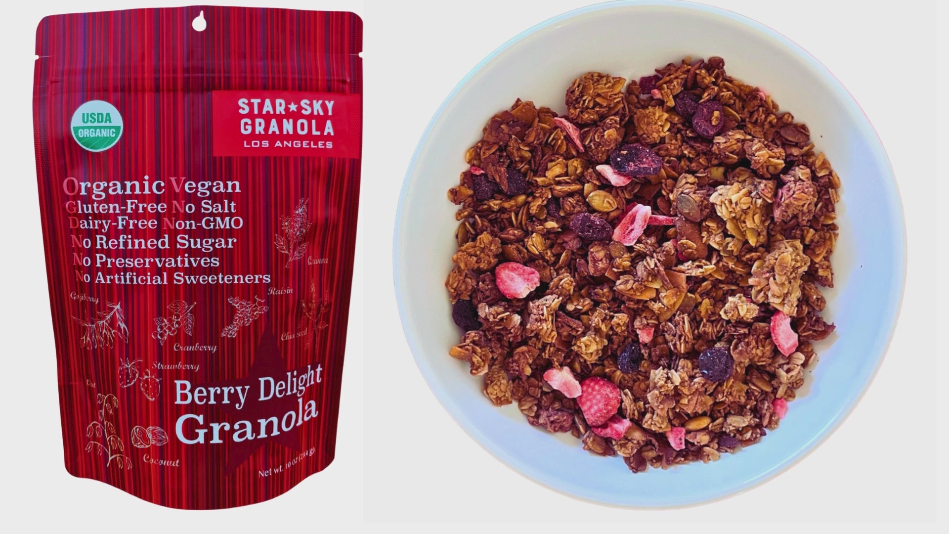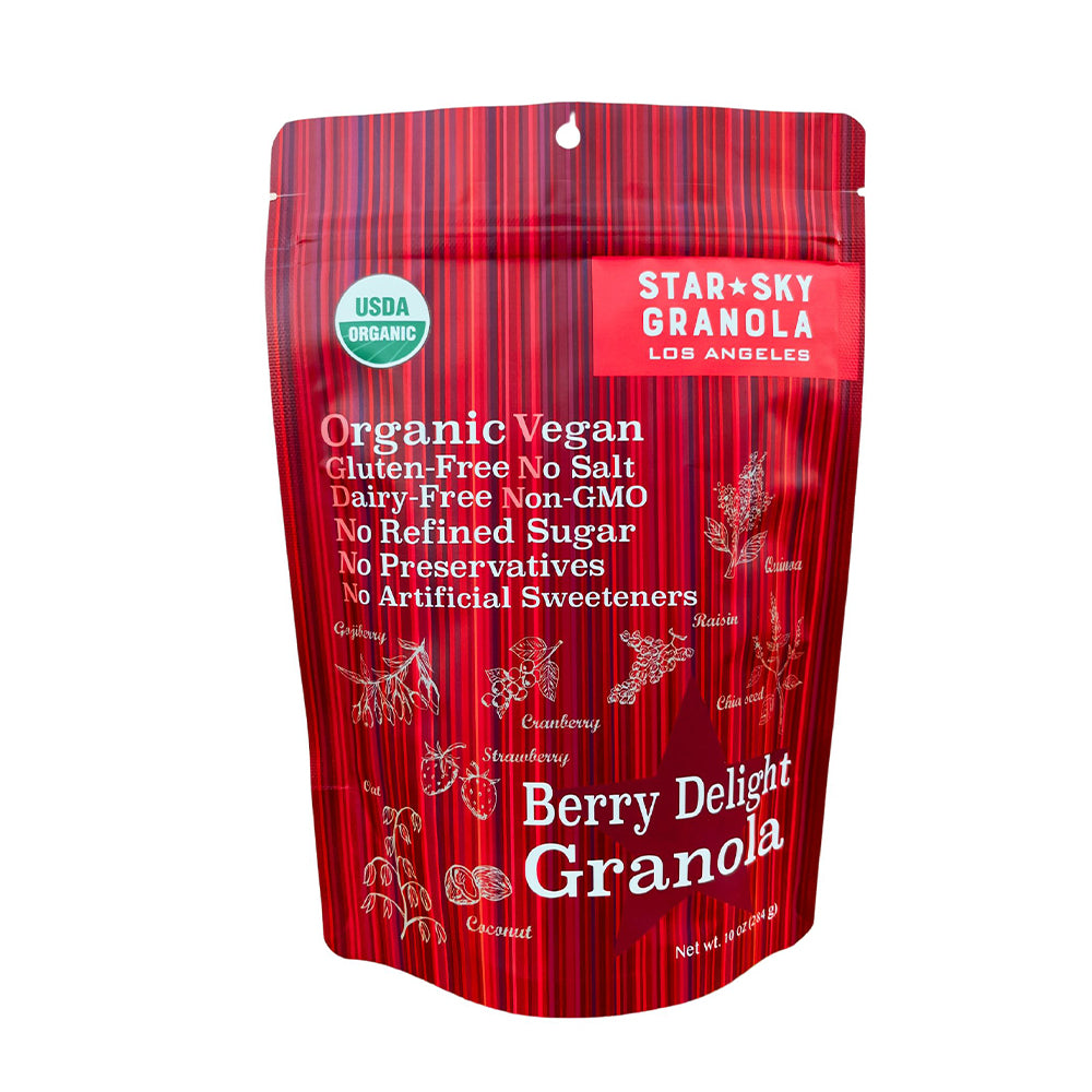 Experience the vibrant flavors of Star Sky Granola's Berry Delight Granola. This delightful blend features organic strawberries, cranberries, goji berries, and jumbo flamed raisins, combined with wholesome oats and seeds. Perfect for sprinkling over yogurt, blending into smoothies, or enjoying straight from the bag. Made with the highest quality organic ingredients, Berry Delight Granola offers delicious nutrition in every bite. It's vegan, gluten-free, non-GMO, and free from refined sugar and artificial preservatives. Enjoy a nutritious snack that's as tasty as it is wholesome.